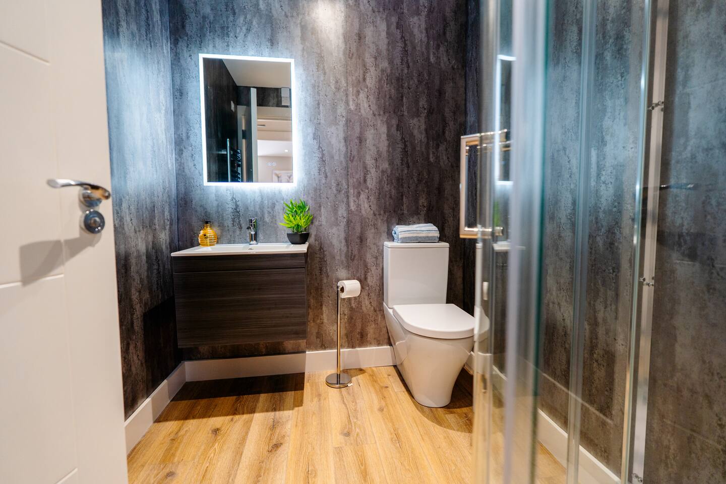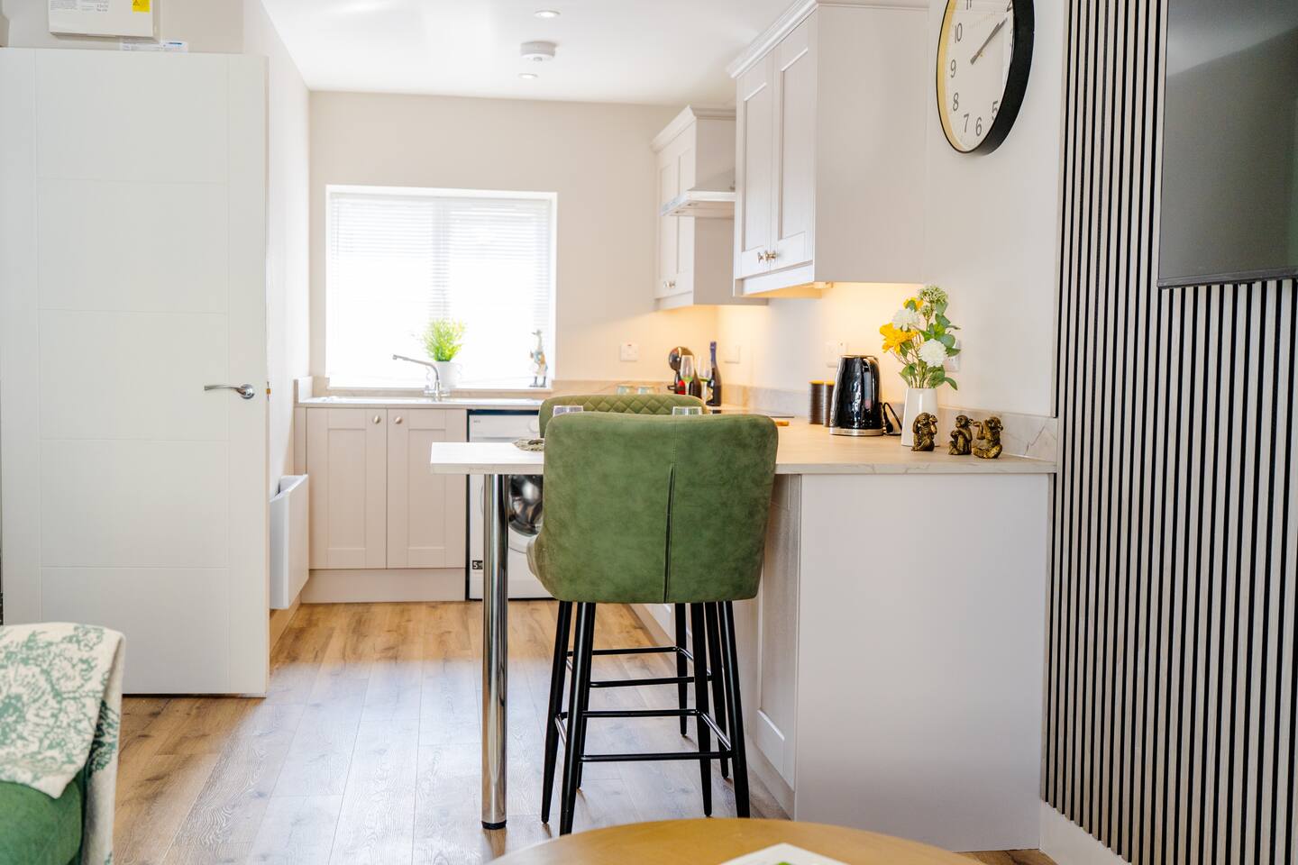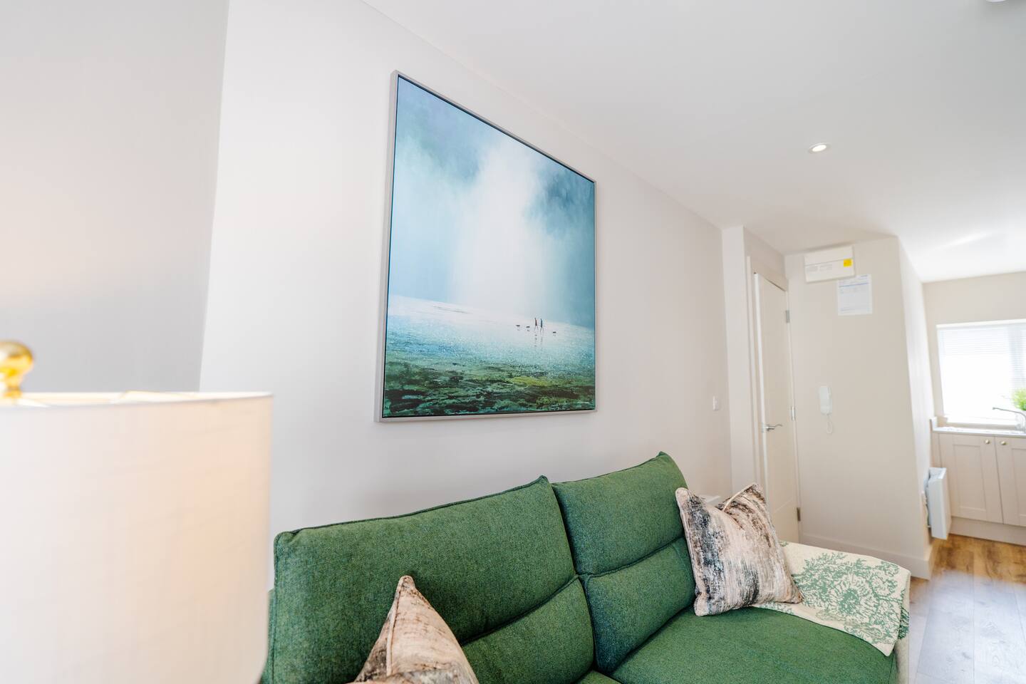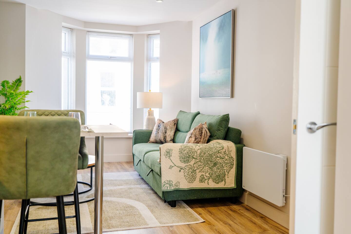 Welcome to your stylish retreat in the heart of Portrush! This beautifully designed first-floor studio apartment perfectly combines modern luxury with coastal charm, offering everything you need for an unforgettable stay on Northern Ireland's stunning Causeway Coast. Step into a thoughtfully designed open-plan studio featuring a comfortable king-size bed and premium sofa bed that easily accommodates up to 4 guests. The space showcases contemporary furnishings with coastal-inspired touches, including plush green seating, natural textures, and carefully curated artwork that reflects the area's maritime heritage. The stunning bathroom is a real highlight, featuring dramatic mood lighting, premium fixtures, and a spacious walk-in shower - perfect for unwinding after a day exploring the coast. Living & Dining: The bright living area offers comfortable seating for relaxation, while the fully equipped kitchenette includes everything needed for light meals and morning coffee. Large windows flood the space with natural light and create an airy, welcoming atmosphere. Modern Amenities: • High-speed WiFi throughout • Smart TV with streaming services • Full kitchen facilities (fridge, microwave, kettle, toaster) • Premium bedding and towels • Central heating Location Highlights: Perfectly positioned in central Portrush, you're just a few minutes from beautiful sandy beaches and the world-famous Royal Portrush Golf Club. The apartment puts you within easy walking distance of the town's best restaurants, traditional pubs, and local attractions, while serving as an ideal base for exploring the Giant's Causeway, Dunluce Castle, and the spectacular Causeway Coastal Route. Perfect for couples seeking a romantic getaway, friends planning a coastal adventure, or anyone wanting to experience the very best of Northern Ireland's Causeway Coast.