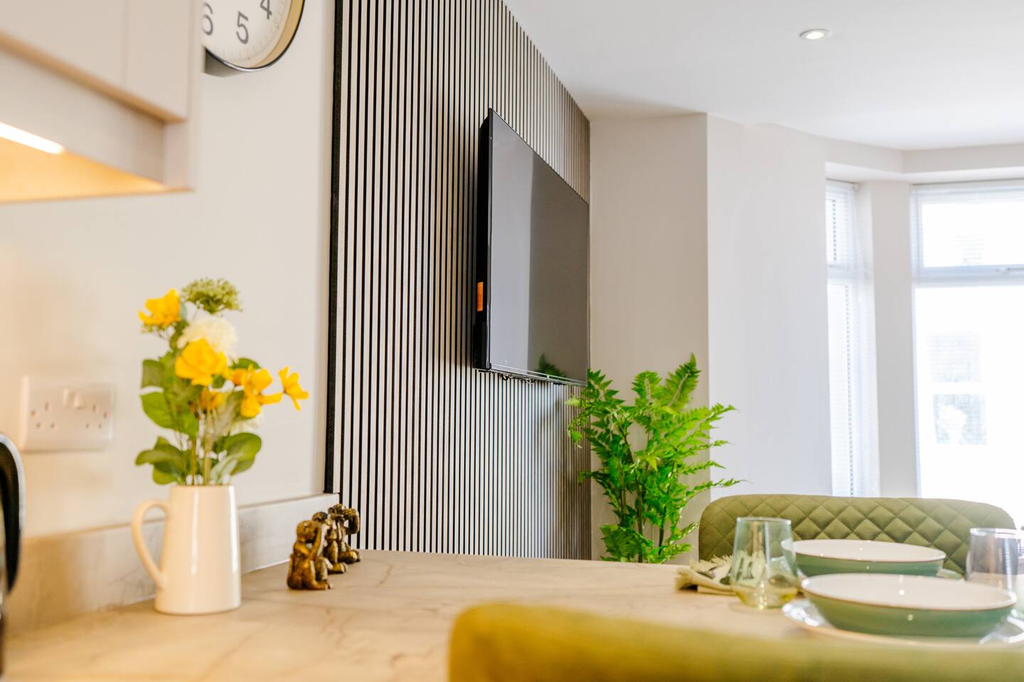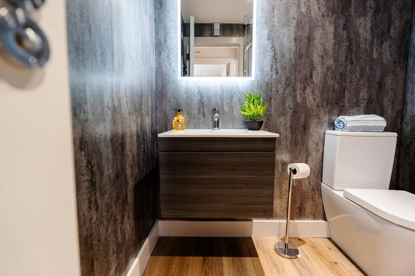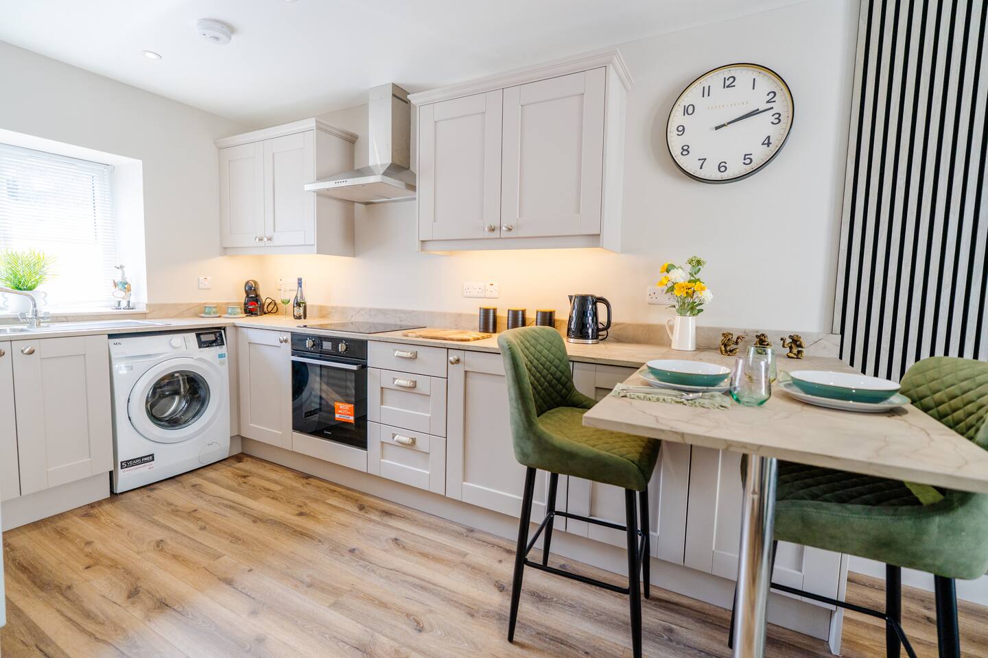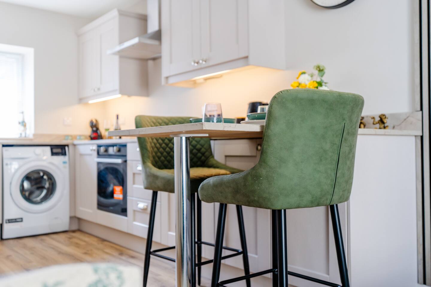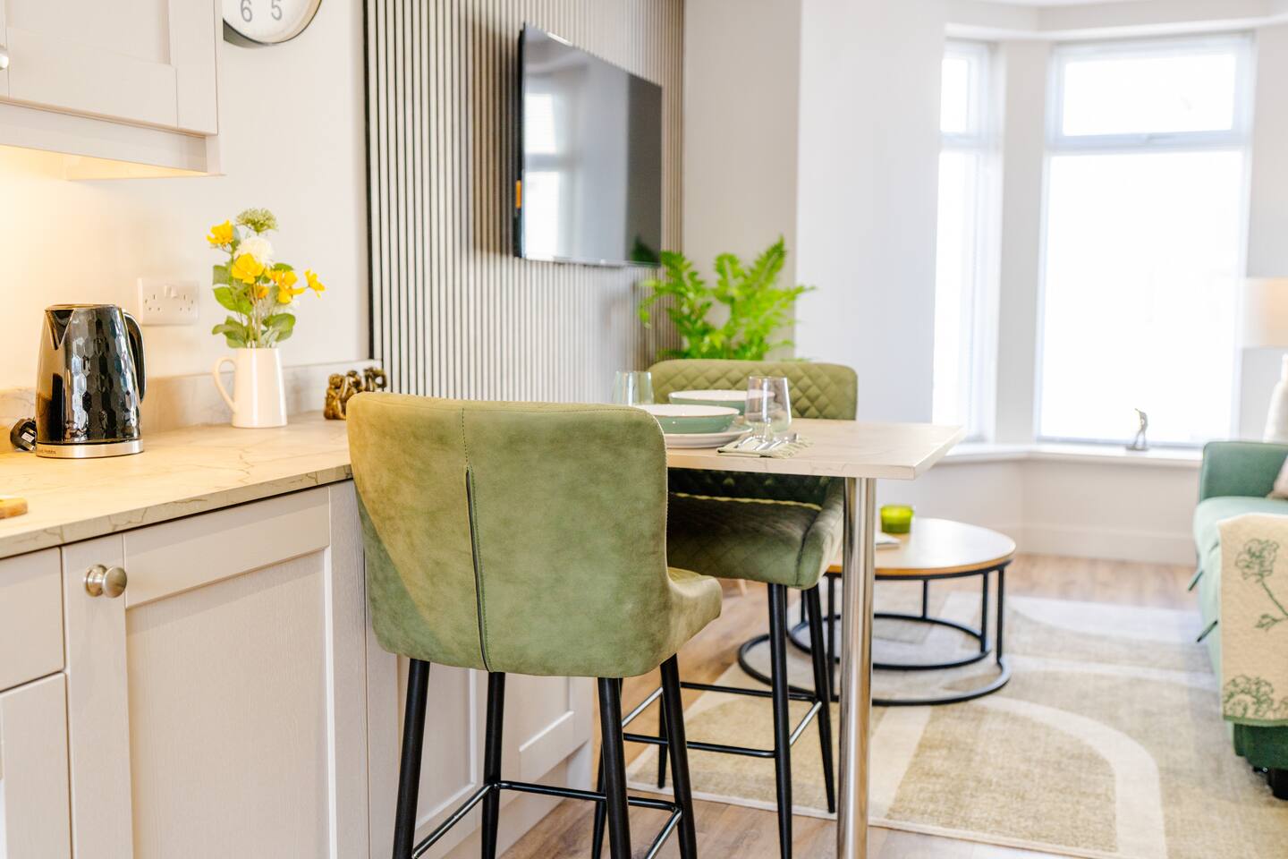 Welcome to your stylish retreat in the heart of Portrush! This beautifully designed first-floor studio apartment perfectly combines modern luxury with coastal charm, offering everything you need for an unforgettable stay on Northern Ireland's stunning Causeway Coast. Step into a thoughtfully designed open-plan studio featuring a comfortable king-size bed and premium sofa bed that easily accommodates up to 4 guests. The space showcases contemporary furnishings with coastal-inspired touches, including plush green seating, natural textures, and carefully curated artwork that reflects the area's maritime heritage. The stunning bathroom is a real highlight, featuring dramatic mood lighting, premium fixtures, and a spacious walk-in shower - perfect for unwinding after a day exploring the coast. Living & Dining: The bright living area offers comfortable seating for relaxation, while the fully equipped kitchenette includes everything needed for light meals and morning coffee. Large windows flood the space with natural light and create an airy, welcoming atmosphere. Modern Amenities: • High-speed WiFi throughout • Smart TV with streaming services • Full kitchen facilities (fridge, microwave, kettle, toaster) • Premium bedding and towels • Central heating Location Highlights: Perfectly positioned in central Portrush, you're just a few minutes from beautiful sandy beaches and the world-famous Royal Portrush Golf Club. The apartment puts you within easy walking distance of the town's best restaurants, traditional pubs, and local attractions, while serving as an ideal base for exploring the Giant's Causeway, Dunluce Castle, and the spectacular Causeway Coastal Route. Perfect for couples seeking a romantic getaway, friends planning a coastal adventure, or anyone wanting to experience the very best of Northern Ireland's Causeway Coast.